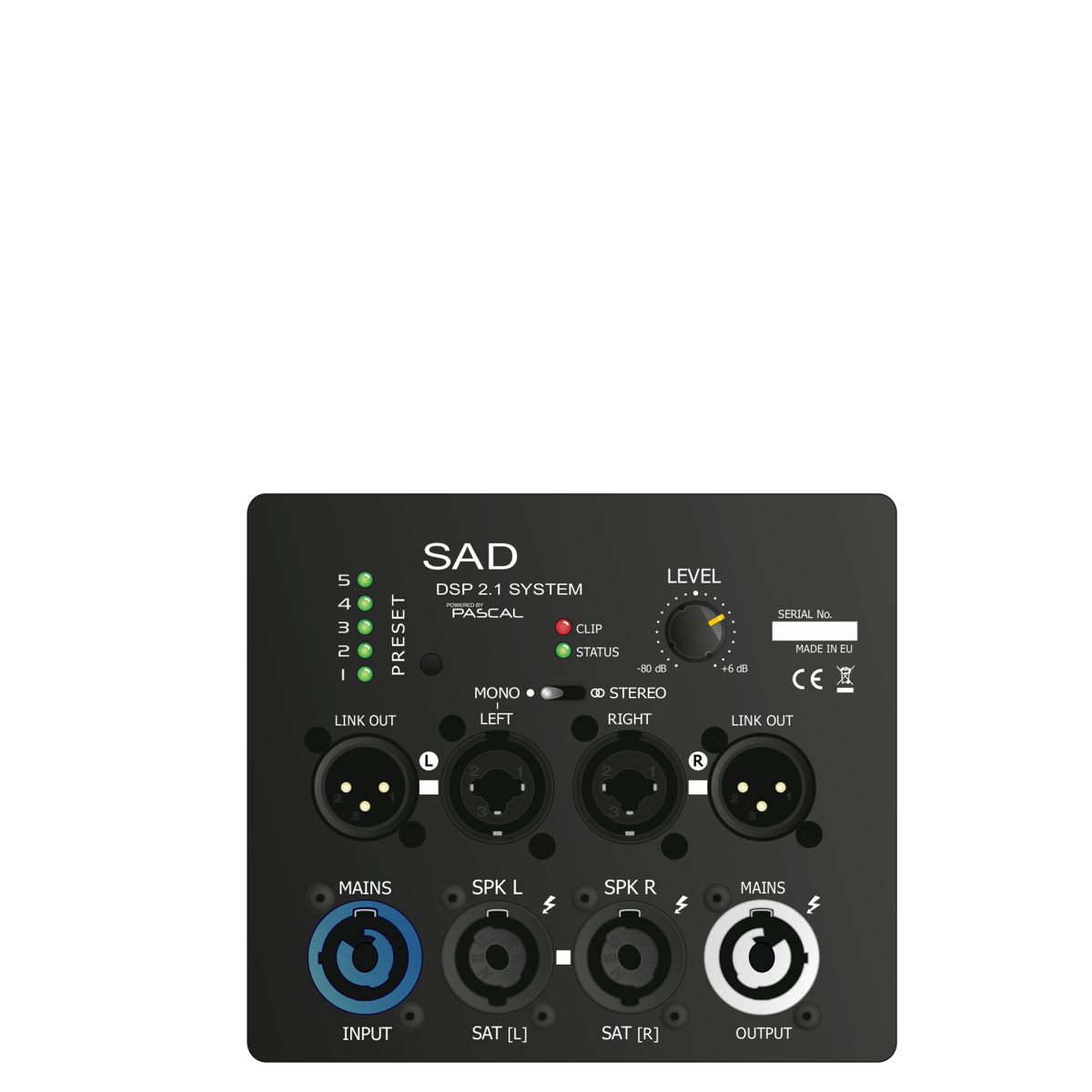 XLR out x2; Speakon out (sat. 8Ω) x2; Powercon out x 1